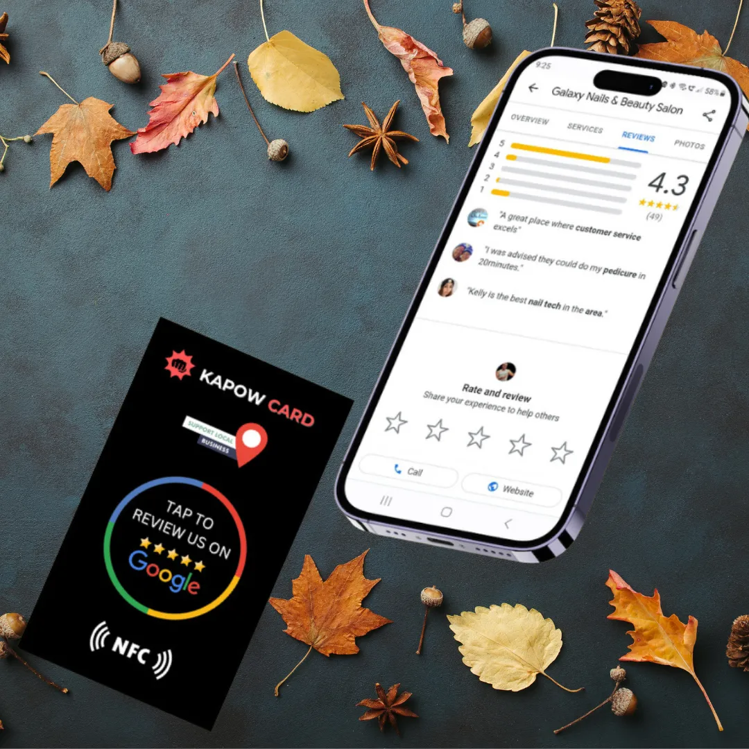 Customer tap thier smart phone, which opens your google review page (Works with both Apple & Android)